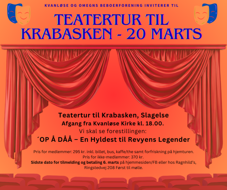 Fredag 20. Marts kl. 18.00 Teatertur til Krabasken, Slagelse med afgang fra Kvanløse Kirke kl. 18.00. Vi skal se forestillingen: ´OP Å DÅÅ – En Hyldest til Revyens Legender Pris for medlemmer: 295 kr. inkl. billet, bus, kaffe/the samt forfriskning på…